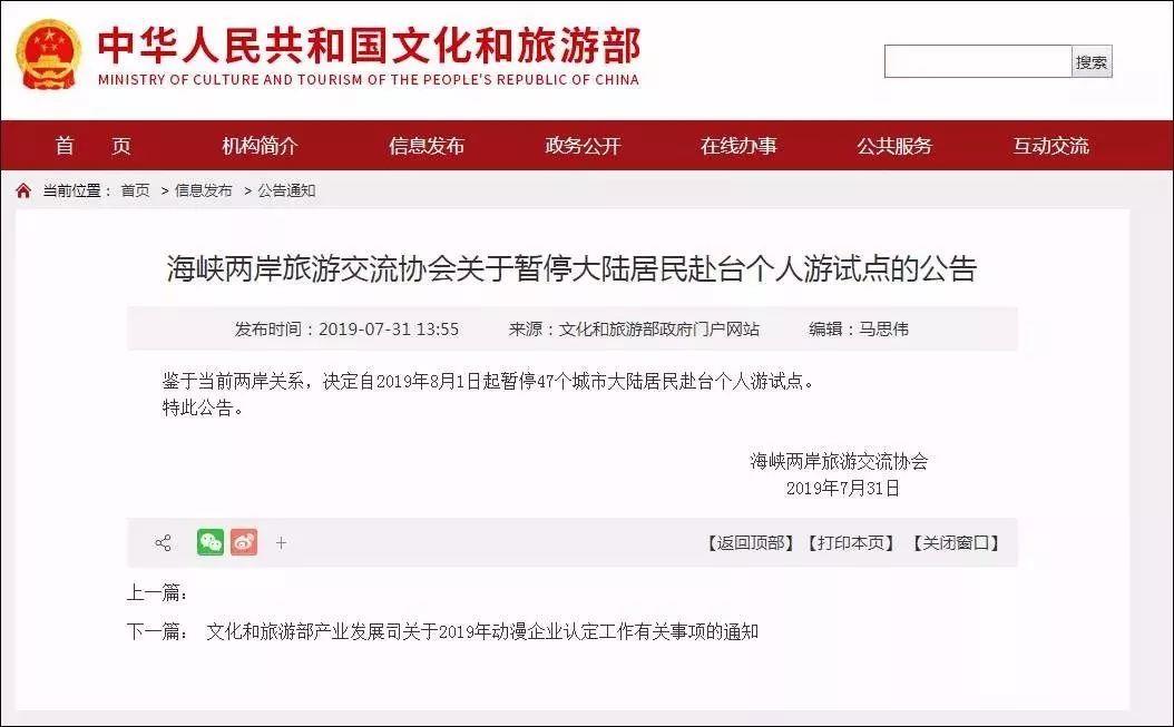 文化和旅游部7月31日在官网发布了《海峡两岸旅游交流协会关于暂停大陆居民赴台个人游试点的公告》,称鉴于当前两岸关系,决定自2019年8月1日起暂停47个城市大陆居民赴台个人游试点。▼