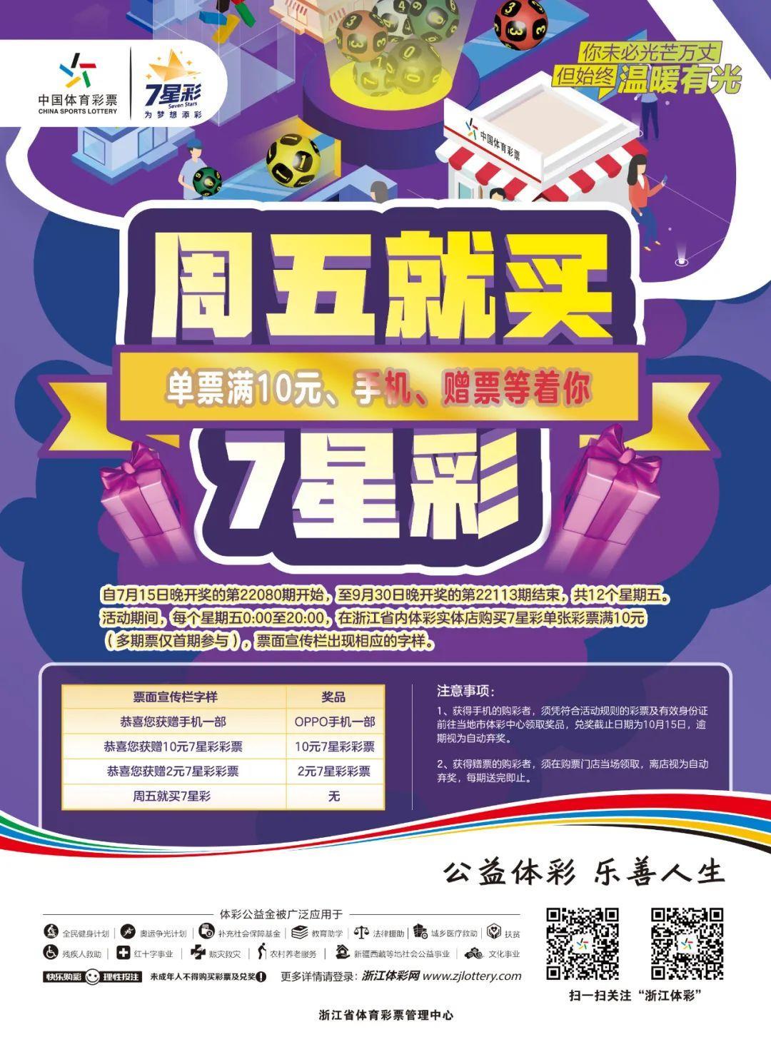目前,浙江体彩周五就买7星彩活动仍在进行中,只要在7星彩星期五购彩日购买7星彩单票金额满10元,除了有机会获取赠票,还有机会获赠OPPO手机,活动持续至9月30日晚开奖的第22113期结束。在7星彩星期五购彩日买上一张7星彩,不仅能收获自己的幸运,还能让周末的快乐再加一码,让快乐不断延续!还在等什么呢?在星期五和7星彩一起邂逅惊喜吧!
