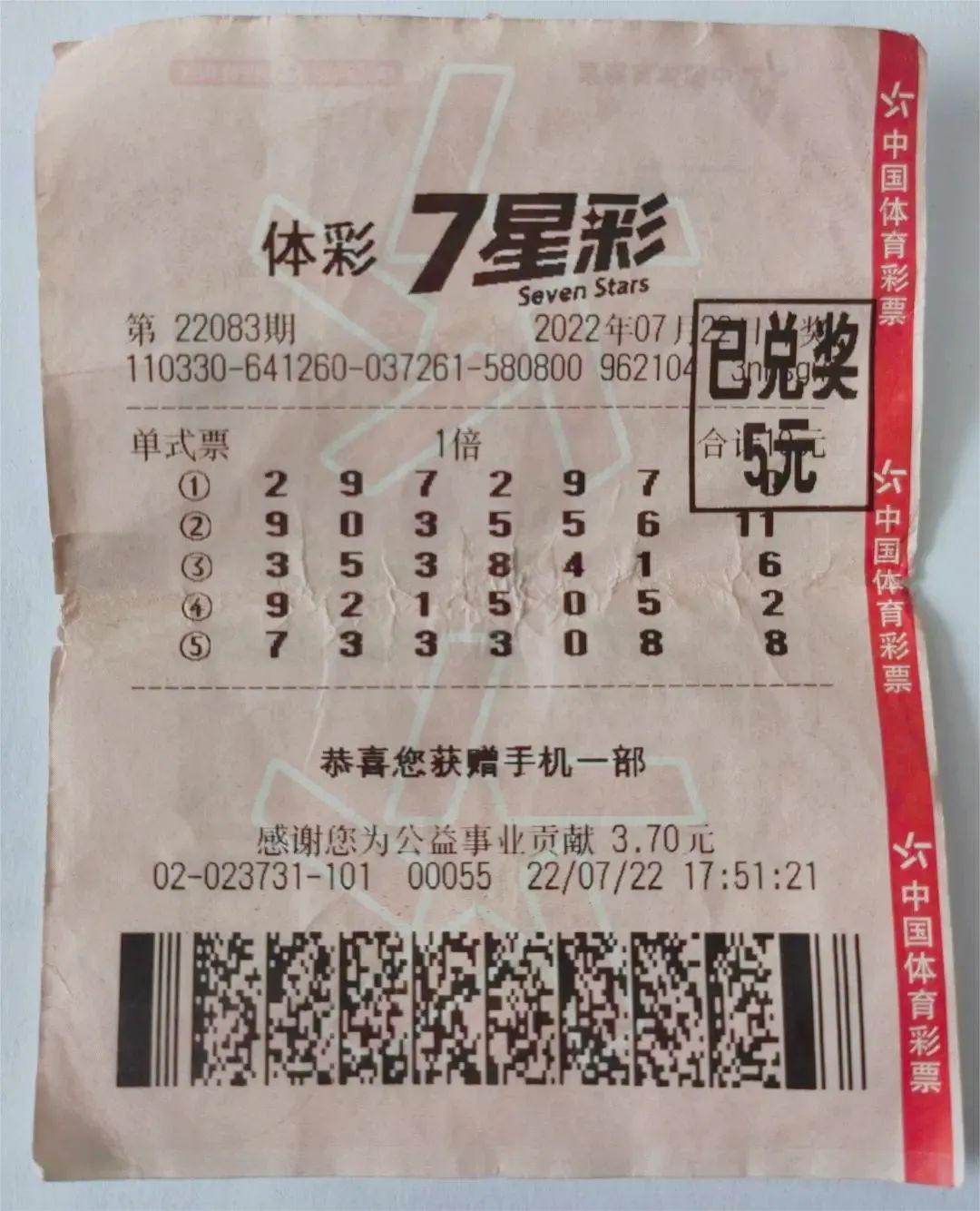7月22日傍晚,老胡下班路过位于宁波市慈溪市横河镇乌山南路338号的3302023731体彩实体店,就进店让销售员彭先生打了一张10元面值的7星彩,由于当时店里人比较多,为了不影响彭先生打票,老胡买完以后就直接回家了,忙碌的彭先生和粗心的老胡两人居然均未发现票面上有“恭喜您获赠手机一部”的字眼。
