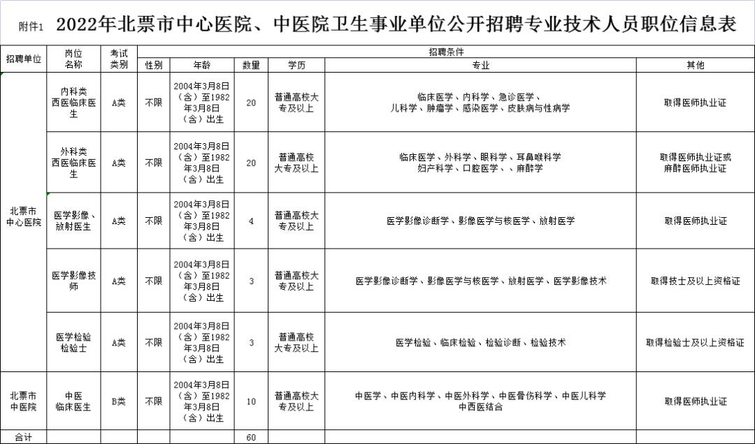 招聘公告在北票人事人才网公开发布,招聘人数、学历要求、具体岗位、资格条件等详情见《2022年北票市中心医院、中医院卫生事业单位公开招聘专业技术人员岗位信息表》(附件1)。