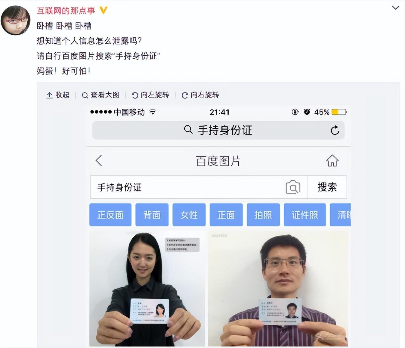 最近,有网友发现在搜索引擎中输入“手持身份证”这一关键词,竟然可以搜到大量手持身份证的照片。知名博主@互联网的那点事在社交平台上分享称:“你知道个人信息是如何被泄露的吗?尝试在百度图片搜索’手持身份证’。”令人震惊的是,许多网友反馈称他们甚至能搜到自己或朋友的身份证照片。经查证,不止百度,即使是Google、360、必应等其他搜索引擎也都有类似的结果。