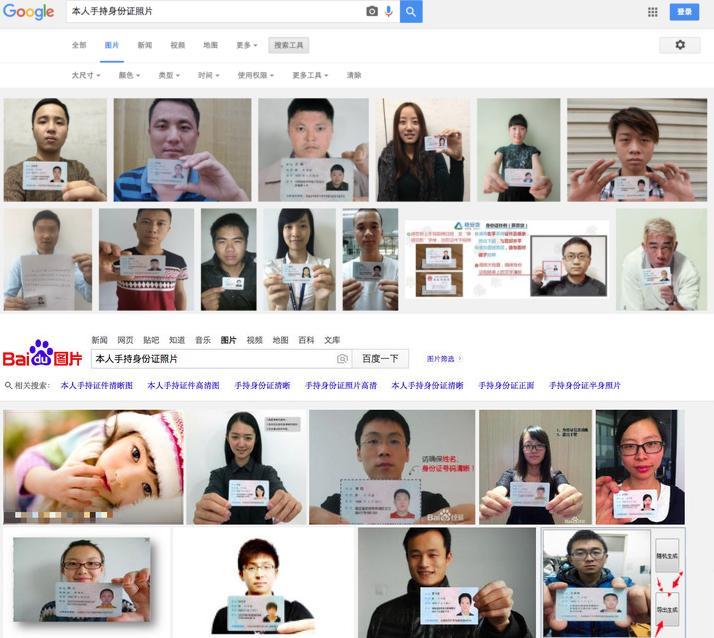 一些网友惊讶地发现,只需在搜索引擎输入“手持身份证”,就能搜到大量此类照片。与一般的身份证信息不同,这些照片不仅展示了持证者的面貌,有时甚至还显示了他们所处的环境信息,这种泄漏无疑更为严重。