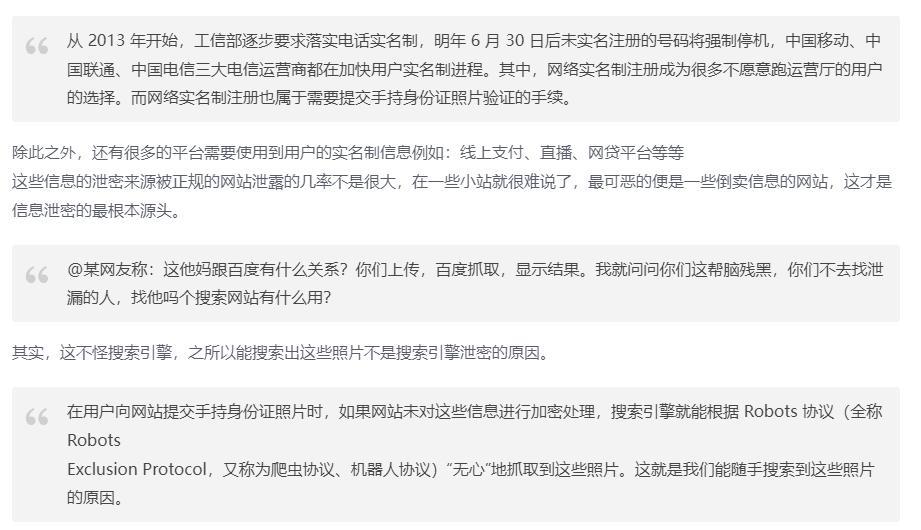 当用户向某些网站上传手持身份证照片,如果这些网站未采取适当的加密措施来保护这些数据,那么搜索引擎可能会根据Robots协议(又称爬虫协议)“不经意地”索引这些照片。这就是为什么我们可以轻易地在搜索引擎中找到这些照片的原因。