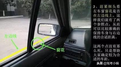 4、关闭转向灯后,要注意左侧车窗窗花在左边线上。这两个点的主要作用是更加确定车身与右边边线的距离。
