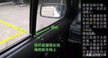 5、当左车窗黑色竖杆底部落在拐角的水平延长线上时,向左打死方向盘。