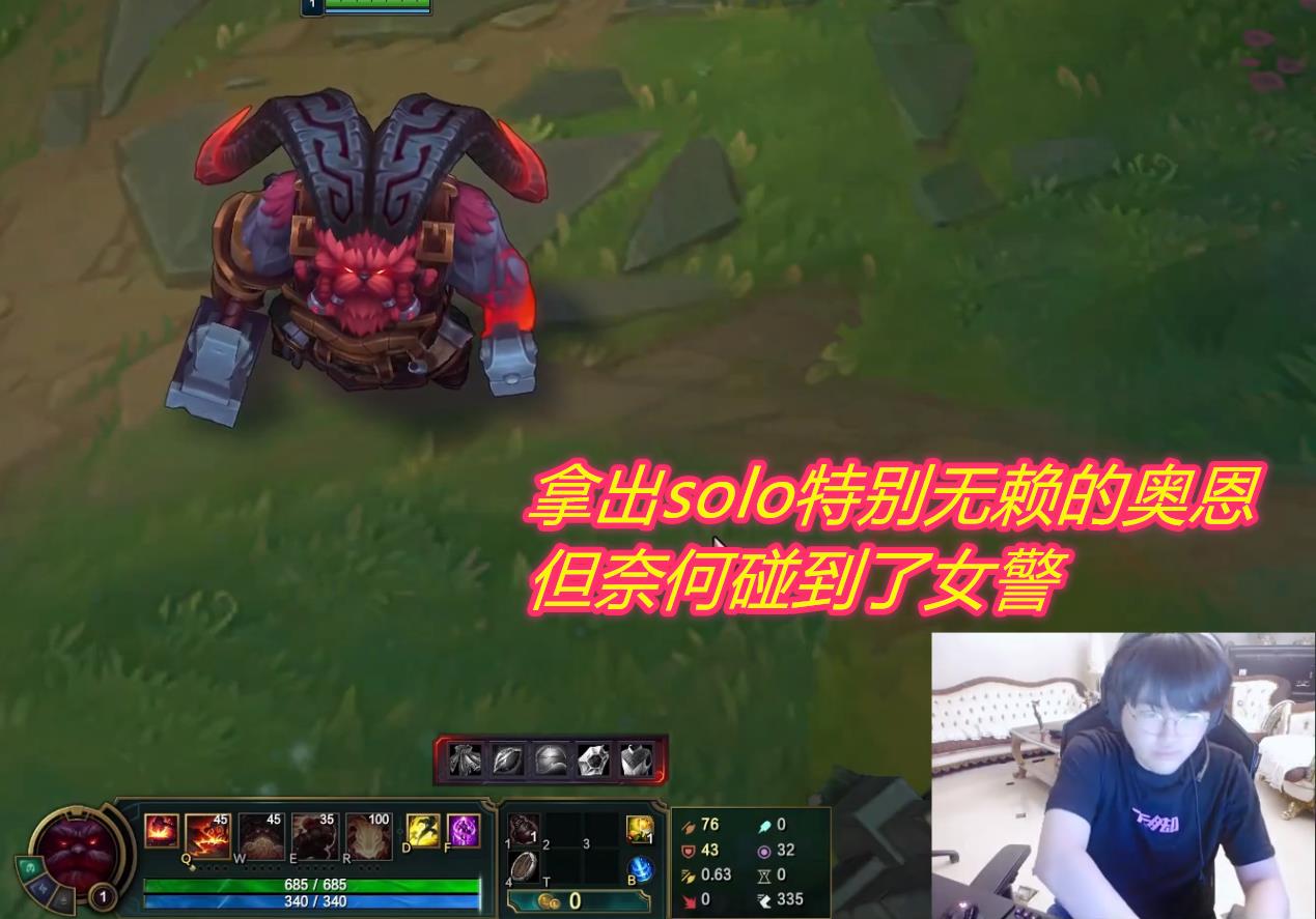 其实奥恩solo并不是很弱,反而还特别的无赖,因为奥恩是一个可以在线上买装备的英雄,solo赛的规则是1塔1血100刀。如果回家出装备,就意味着小兵肯定会拉开距离。并且奥恩对阵一些近战类的英雄还真不一定吃亏,毕竟奥恩有百分比伤害的技能。不过却没有想到,董月月直接拿出了一手迅捷步伐的女警,这可让姿态着实头疼。