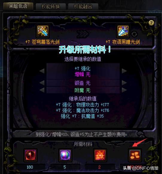 升级一把夜语黑瞳武器,同样需要180个黑瞳石,还要额外的灵魂之源和金币,但精炼石较少。当然,这金币数量,跟武器的强化增幅高度息息相关。不过,用来进行幻化的话,是不需要强化的,额外80W金币就行!