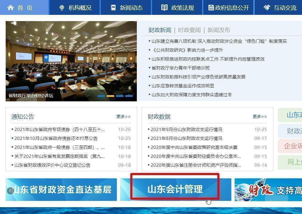 进入《山东省财政厅》官网,在首页下方找到“山东会计管理”