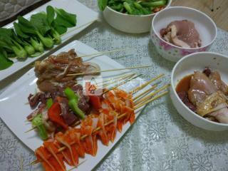 3. 无烟腌制的,加入盐,少许酱油,调和油,姜丝等腌制15分钟,不需要腌制的,串签串好。