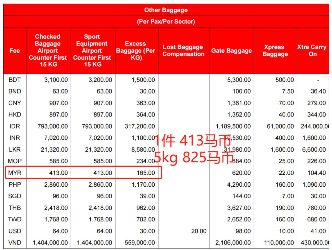 托运收费标准根据AK官方的收费标准,首件托运行李的收费为907元(15kg及以下),而超重则需支付363元/kg的费用,那么算下来是按20kg计算的话就是2722元(907+363*5),但是为什么视频中的收费是1807元?因为是飞吉隆坡的航班,工作人员可能是按马币(MYR)计算的费用?超重5kg是825马币+托运1件行李413马币。如果计算汇率是1:1.46的话,那么就是1204+602,就是视频中的1205+602=1807了。经过协商,工作人员应该是选择了相对划算的货币收费标准来降低收费。