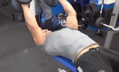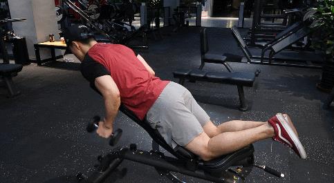 我们首先要将哑铃凳的倾斜角度调整至45°~60°,然后将你的身体俯卧在哑铃凳上,两个手肘初始保持90°,然后上臂伸到身体的后方,每个动作都要保持。当然,这个动作也会稍微用到你的背部肌肉进行发力。