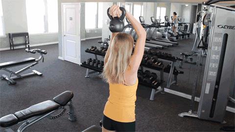我们在进行这个动作的时候不要选择太大的重量,不要用你举得起作为一个标准,你要以你的慢慢下落为标准去选择一个合适的重量。要注意的是手肘要尽量贴近你的脑袋两旁。