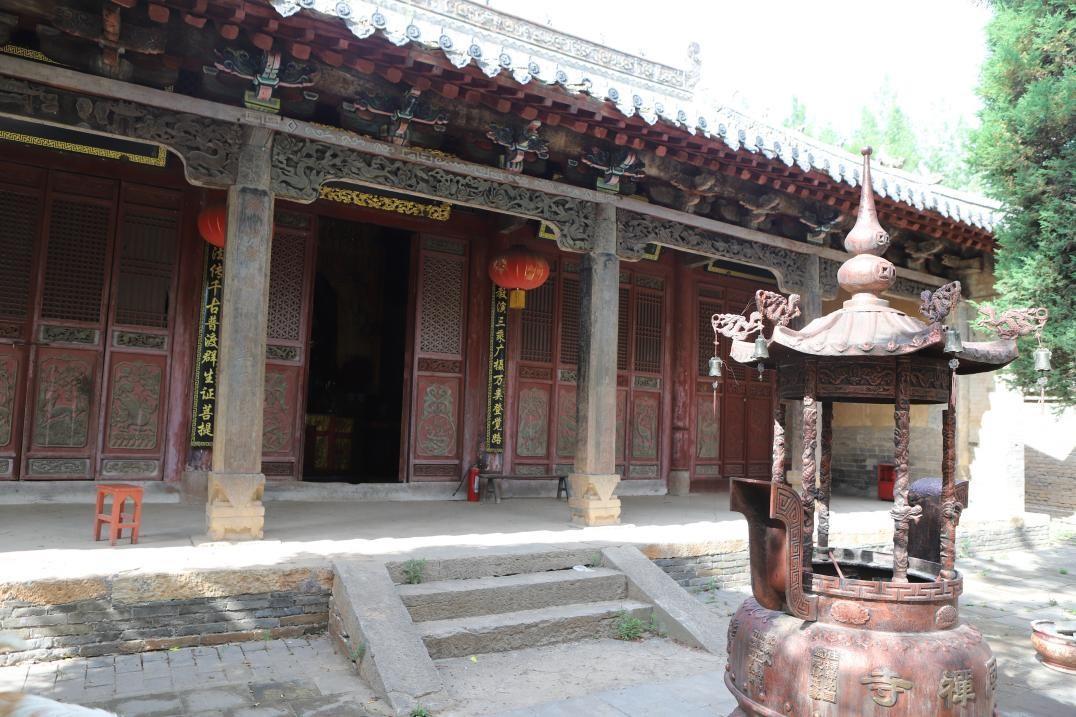 中殿为面阔3间,进深3间的歇山式建筑,四面带有回廊,檐下施三踩单昂斗拱,龙风大脊,正吻和脊兽如生,六抹格扇门。殿后北墙外侧东西各砌清顺治年间(1644年)重修寺院的石碣1块,中殿东、西两侧有条石砌成的莲花池各一个。