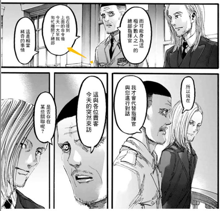 马迦特队长还说有老鼠进了他们家,暗示有间谍进入了玛莱国,有趣的是画面一转,来到了艾伦这里,这里很明显说艾伦就是那只老鼠。