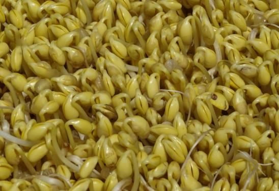 将选好的大豆进行清理,然后用温水浸泡8个小时左右,水温在15摄氏度比较合适,所以建议可以在夏季进行浸泡,将浸泡好的豆子直接捞出来晾干,然后用温水再进行清洗,就可以直接将豆子放在泥盆中进行种植。种植好之后,需要用旧的棉被或者棉布将泥盆盖住,以达到保暖催芽的效果。在催芽的前期,尽量每隔1~5个小时翻动一次,直到豆子萌芽才不做翻动。在此过程中也要观察豆芽的生长情况,如果豆子发干没有水分,那要及时补充水分。