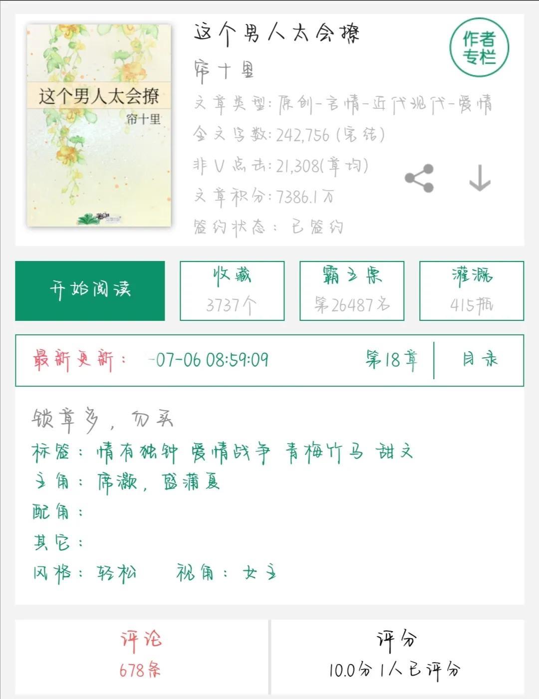 今天推荐帘十里的文,不知道你们有没有看过她写的文,她可是我心中又一个宝藏作者,基本上每个文都很好看,她写的文我基本都重刷好几遍,每过一段时间我都会拿出来看看。