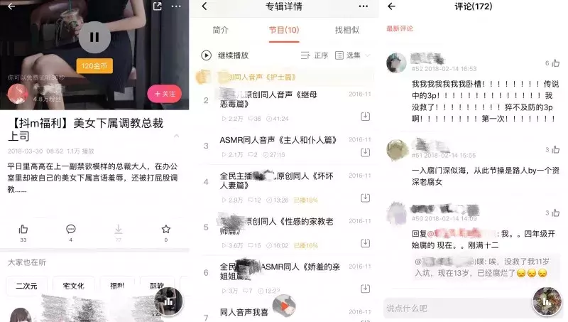 在该剧的172条评论中,除表达“听着就爽”、“好刺激”等感受外,还有大量疑似未成年人在交流。如,有人称“边赶寒假作业边听”,有人称“边上空中课堂边听”,还有多条评论询问,“我11/12/14岁,还有救吗?”获“过来人”回复:“我9岁入坑,现在14,俗话说一如腐门深似海,从此节操是路人”,“我爸妈都不知道我污到不行”。