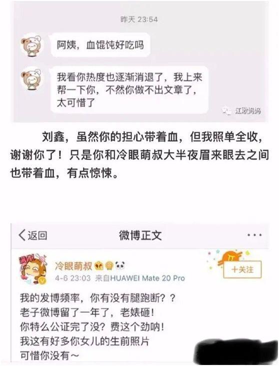 刘鑫在过去的三年里,不断利用微博对江歌妈妈进行讽刺和谩骂,甚至在清明节时还发微博激怒江歌妈妈:“阿姨,血馄饨好吃吗?”
