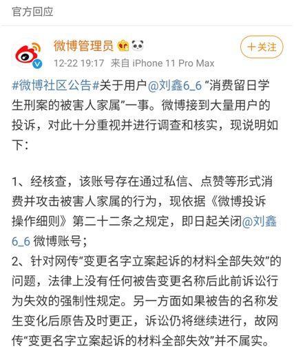12月22日,新浪微博管理员发出公告:经核查,该账号存在通过私信、点赞等形式消费并攻击被害人家属的行为,现依据《微博投诉操作细则》第二十二条之规定,即日起关闭@刘鑫6_6 微博账号。