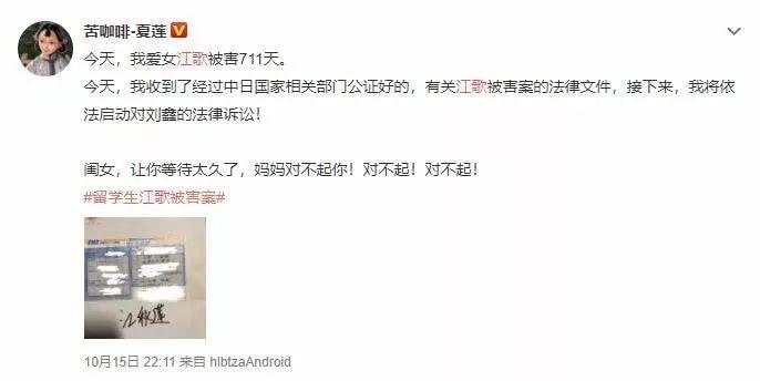 2018年10月15日晚,江歌妈妈认为刘鑫应该对江歌的死亡承担一定的道德责任,于是发文宣布将对刘鑫提起诉讼。