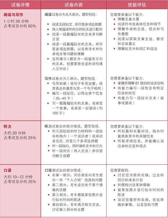 PET考核考生的实用英语技能,无论是对于学习还是工作,PET考试都能促进考生语言能力的发展,并为希望参加剑桥第一证书英语考试(FCE)的考生打下坚实基础。PET考试适合与在日常生活中具有中等读写水平的考生。