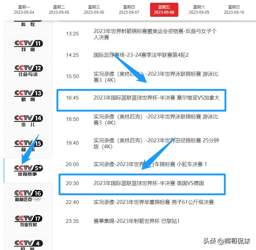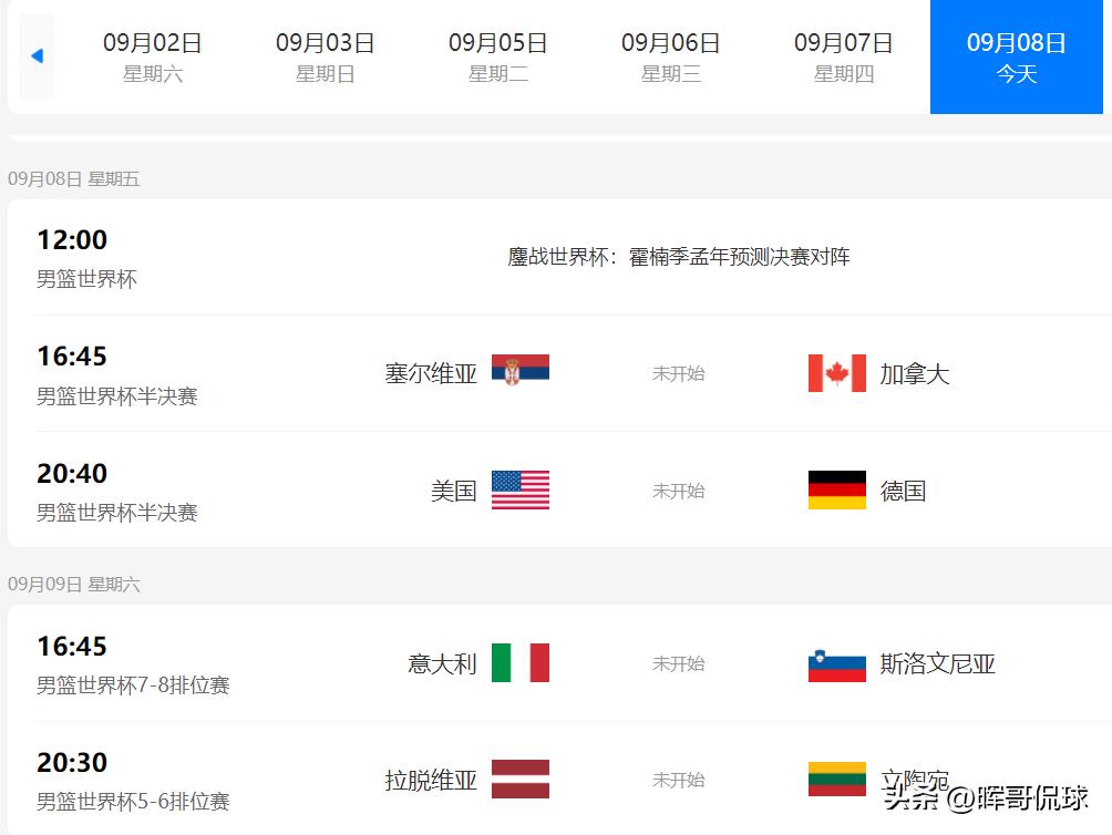 9月8日16:45,塞尔维亚男篮vs加拿大男篮(CCTV5+直播、咪咕体育直播)9月8日20:40,美国男篮vs德国男篮(CCTV5+直播、咪咕体育直播)