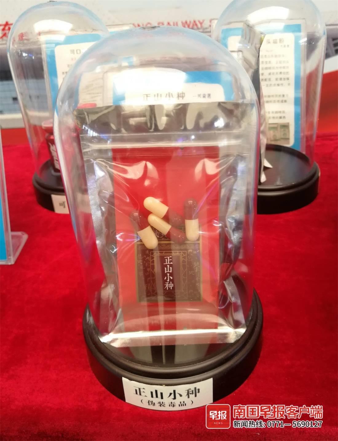 24日上午,南宁东站候车厅北侧的活动展示台上摆满了形形色色的毒品模型,其中一些熟悉的名称吸引了人们的注意,如“奶茶粉”“茶叶包”“咖啡包”“巧克力”。