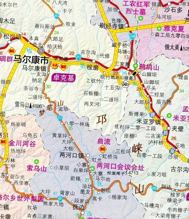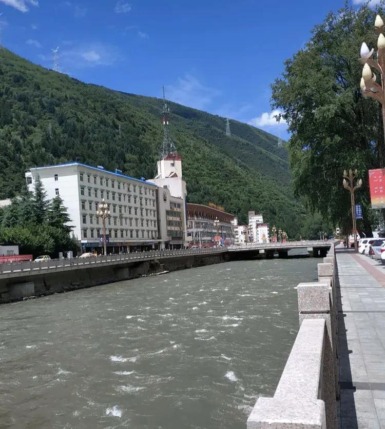 从鹧鸪山沿着317国道继续西行,约80公里就能进入马尔康市区。这座城市是四川省阿坝州的州府,在藏语里是火苗旺盛之地。马尔康市是一个只有五六万人口的县级市,总面积6633平方公里。马尔康市区沿着河谷发展,长宽比为40:1,比兰州市还狭窄,因此成为川西有名的“一线”城市。