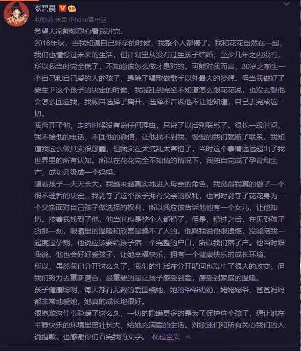 希望大家能够耐心看我讲完。2018年秋,当我知道自己怀孕的时候,我整个人都懵了。我和花花虽然在一起,我们也憧憬过未来的生活,但计划里从没有过生孩子结婚,至少几年之内没有,所以我当时完全慌了,不知道该怎么做才是对的。可能对我而言,30岁之前生一个自己和自己爱的人的孩子,是除了唱歌做歌手以外最大的梦想。但当我做好了要生下这个孩子的决定的时候,我混乱到完全不知道怎么跟花花说,也没去想他会怎么回应我,我顾自选择了离开,选择不告诉他不让他知道,自己去完成这一切。我离开了他,走的时候没有说任何理由,只说了以后别联系了。很长一段时间,我不接他的电话,不回他的微信,让他找不到我,慢慢的我们就断了联系。我知道我这么做其实很愚蠢,但我实在太慌乱太害怕了,当时这个事情远远超出了我世界里的所有认知。所以在花花完全不知情的情况下,我独自完成了孕育和生产,成功升级成一个妈妈。