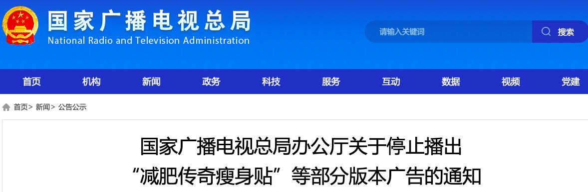 本报讯 据国家广播电视总局消息,国家广播电视总局办公厅22日发布关于停止播出“减肥传奇瘦身贴”等部分版本广告的通知,全文如下: