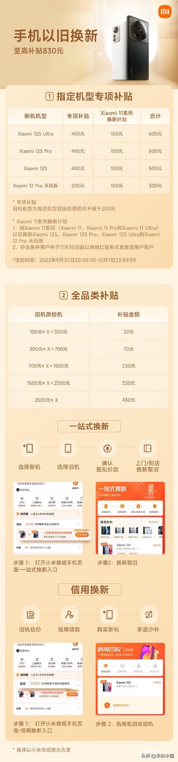 指定机型专项补贴支持小米12S Ultra、小米12S Pro、小米12S及小米12 Pro天玑版,均是近期刚发布的新机,专项补贴分别为400元、400元、400元、200元。加上小米11系列换新计划再补贴100元后,购买四款新机共计分别补贴500元、500元、500元及300元。活动时间为9月30日-10月7日。