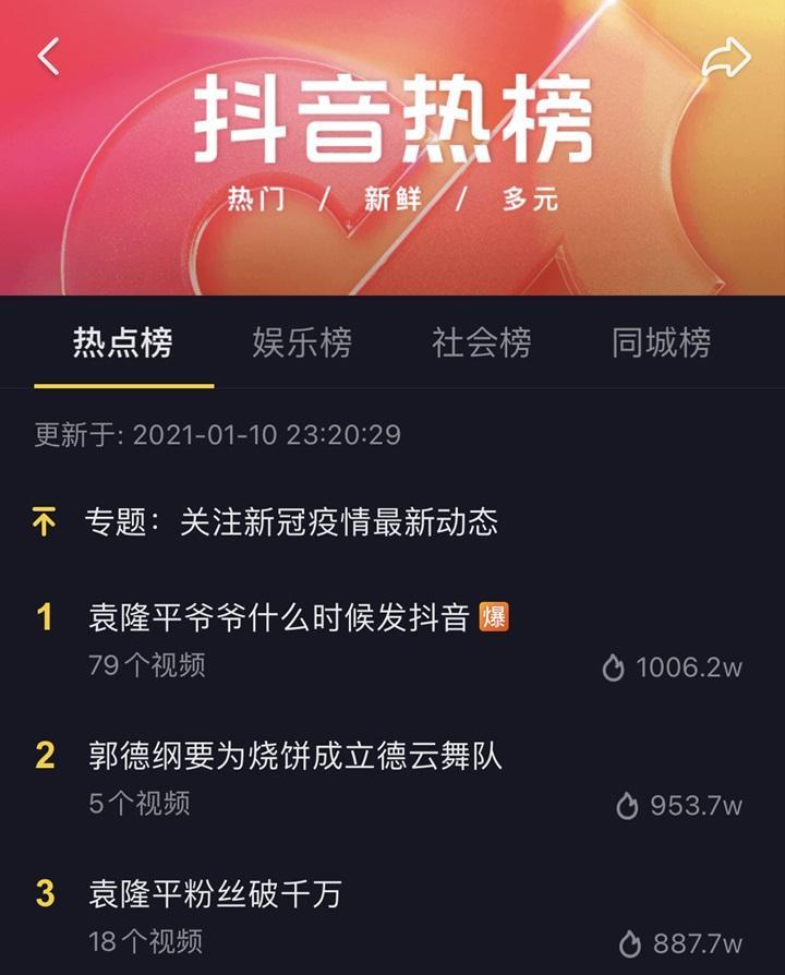 此外,抖音热榜目前排在第一位的话题是 “袁隆平爷爷什么时候发抖音”,想必这也是不少网友好奇的问题。