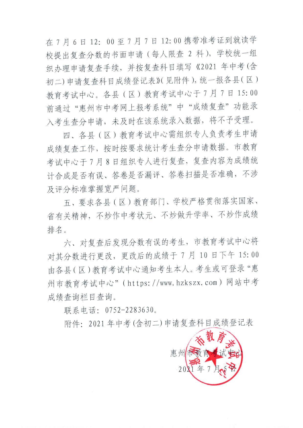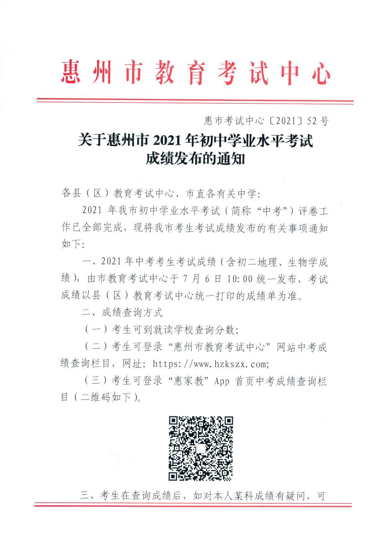7月5日,惠州市教育考试中心发布了《关于惠州市 2021 年初中学业水平考试成绩发布的通知》,其中提到2021 年惠州初中学业水平考试(简称“中考”)评卷工作已全部完成。该中心将于7月6日10时统一发布中考成绩,考生可通过以下三种方式查询中考成绩: