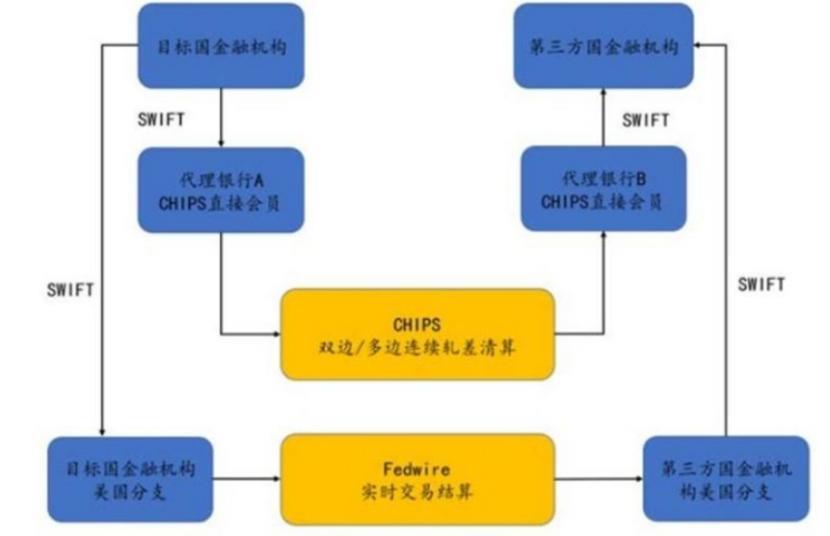 一整套完整的美元支付结算体系主要包括:SWIFT、CHIPS和FEDWIRE三个系统,SWIFT主要用来作为信息传输,CHIPS和FEDWIRE主要用来进行资金结算,其中CHIPS在美元中转到其他国家时清算使用,FEDWIRE 用于美元在美国境内实时交易结算。