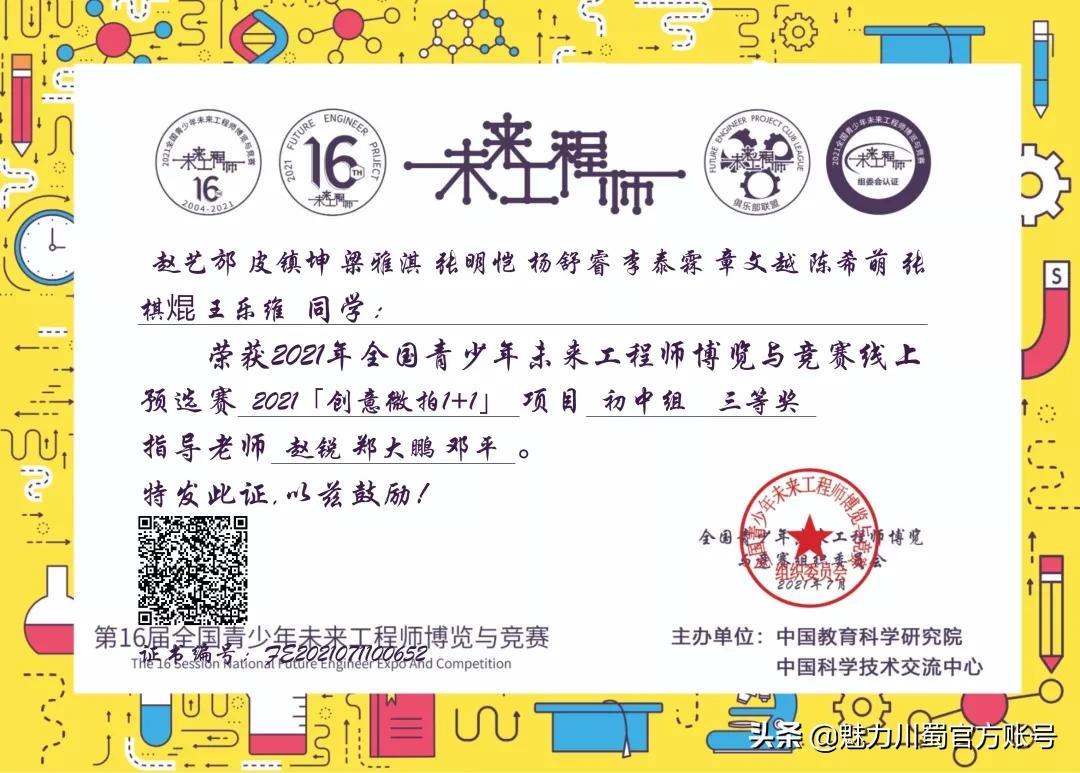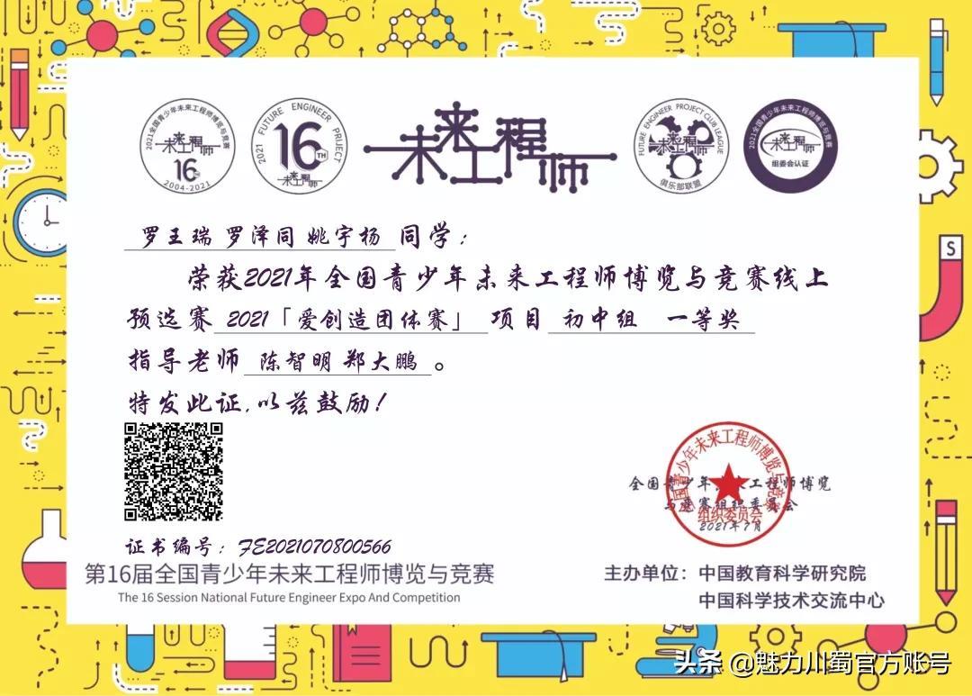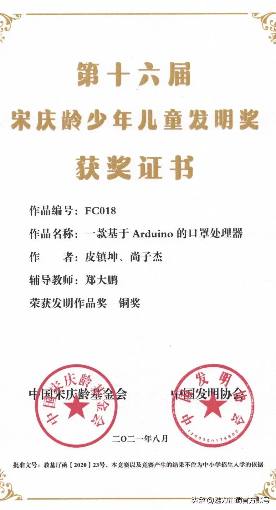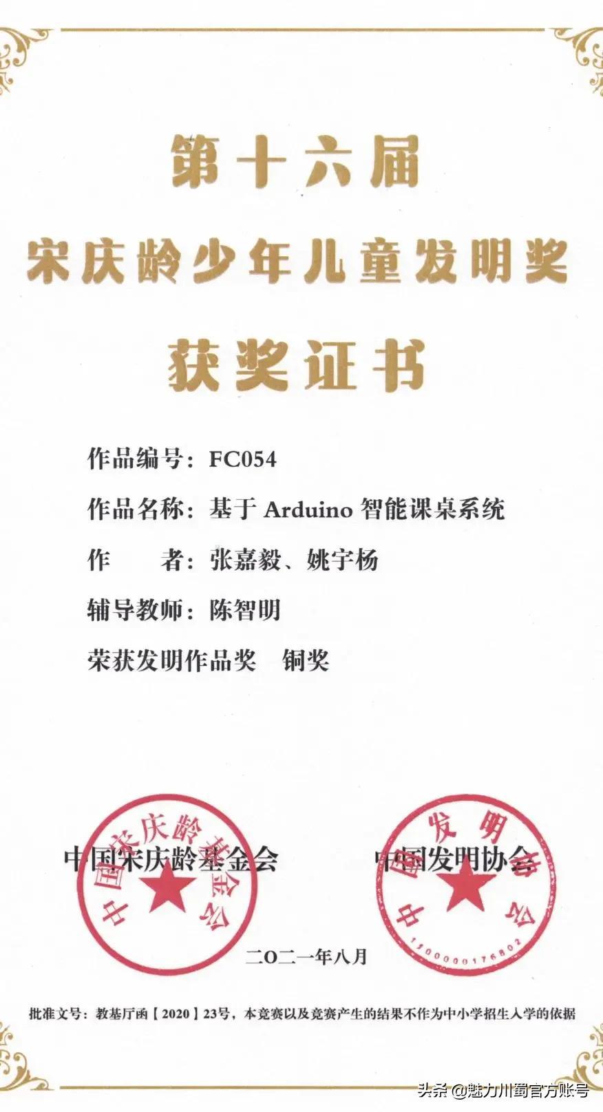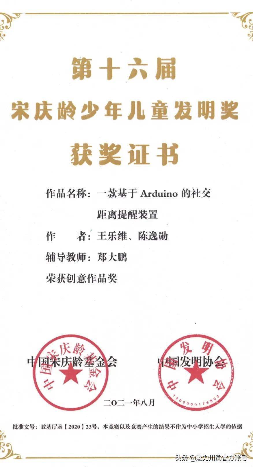 第16届宋庆龄少年儿童发明奖评选,4人获铜奖,2人获创意作品奖,获奖人数居四川第一。