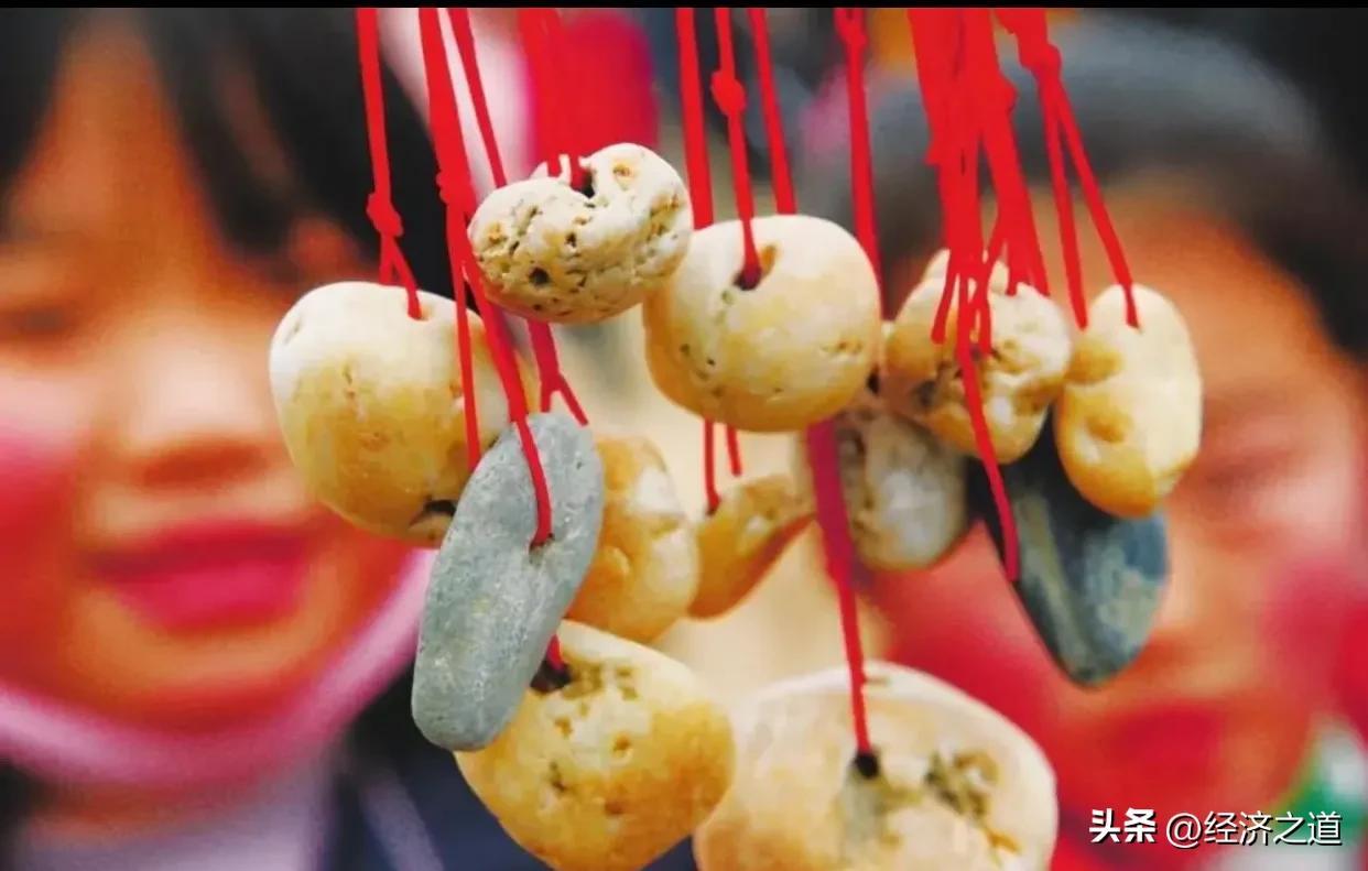 二十天穿,二十一地穿,湖北等长江中游地区农历二十一有将石子尤其是带孔石子收集起来,收集起来寓意美好,祈求生活美满。