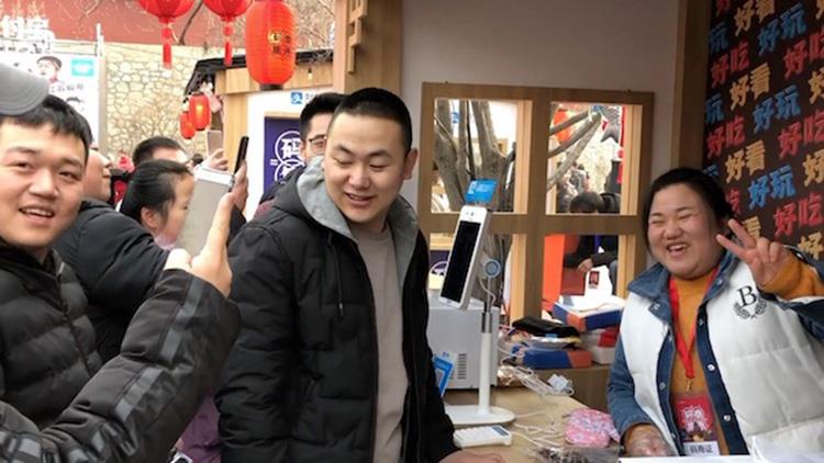 2019年1月26日,陕西省西安市,黑河腰子姐出现在西安,不停地招呼来往顾客尝尝她家的风干牛肉,一口一个“来了,老弟”让现场气氛异常活跃。腰子姐的店铺前人山人海,火爆程度似明星见面会现场。