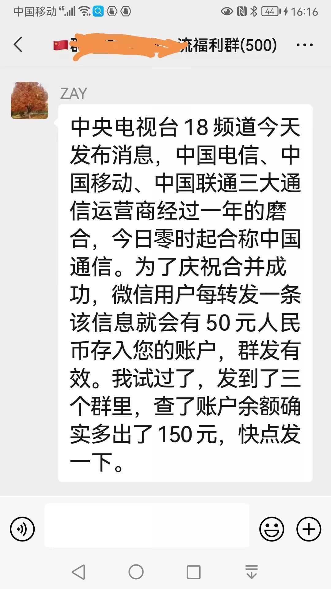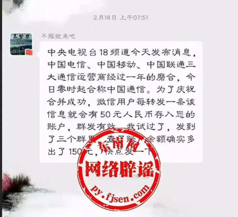 今天在一个微信群里突然看到一条消息,说是移动、电信、联通三家公司要合并。而且是中央电视台18频道发布的消息。吓了一跳,赶紧上网查一查。上网一查,此消息在今年五月份就传了一段时间,已经有不少平台已经辟谣。而且中央电视台只有十七个频道,根本没有十八频道。这样不靠谱的消息和不知所踪的来源还能有人相信?还有人在网络微信群里传播?
