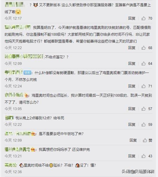 很多人怒喷的主要原因还是因为鸡里奥的活动事件,鸡里奥活动因为有事件限制,而且很多人是花了钱来冲活动的,所以这次延长的确是很耽误大家的时间,不少人要求鸡里奥活动也必须延长;另外也有人表示17日是无限火力的最后一天,偏偏这一天维护还维护这么久,能不能考虑一下玩家的感受?更有不少人表示要不是现在赛事撑着,谁还玩这破服务器?