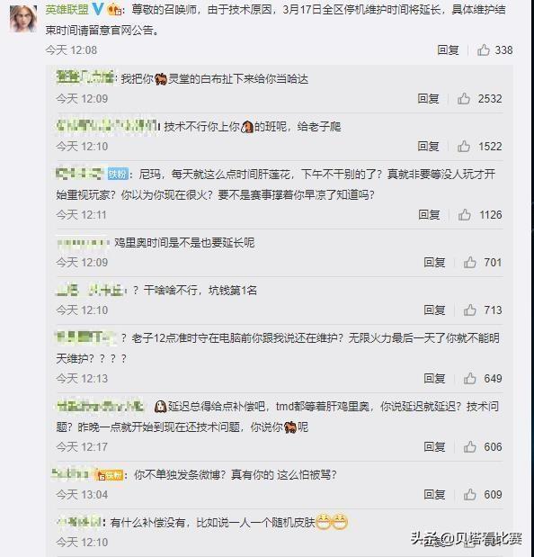 由于最近有很多活动,很多网友都是趁着这段疫情期间,还没上学或者上班,所以加紧时间想要多玩几把游戏。但是因为这次突然的维护,打乱了很多人的计划,而LOL官方也在介绍“孙悟空”即将重做的微博下方评论区,留言回应了这次突然的延长维护,表示是因为技术原因,所以17日的停机维护时间延长,具体结束的时间大家留意官网的公告即可。没想到条评论下方遭到了大量网友的爆破。