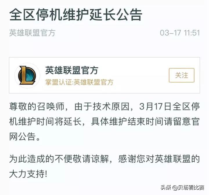 3月17日这一天,对于一些原本打算等着国服维护结束后,开始征战峡谷的的朋友们来说,应该是非常煎熬难受的一天,主要是因为3月17日凌晨服务器开始维护,最开始说的是维护到第二天中午12点,但是没想到这一维护就到了下午,快12点的时候,LOL官方发布通告说国服的维护将继续延长,以至于截止到目前下午16点,已经超过了16个小时,LOL国服的服务器仍然尚在维护之中。