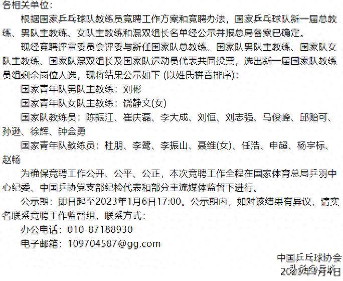 但是那时候国乒团队忙着参加各种比赛,腾不出手来解决教练员的问题。2022年年底,在结束一整个赛季的比赛之后,国乒进行了教练员的交流和选拔活动,线上线下相结合的形式进行竞聘,选举产生了全新的教练管理层!