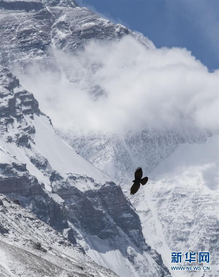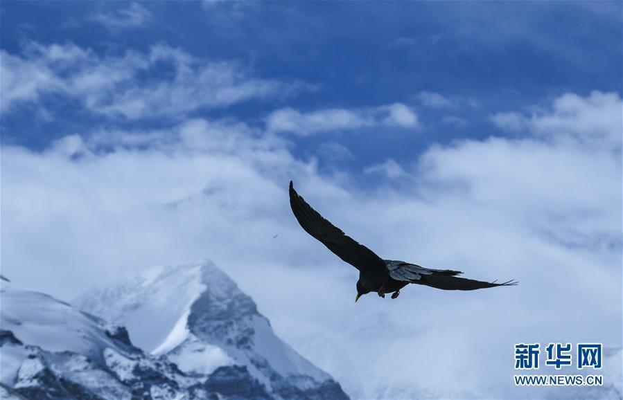 在珠峰国家级自然保护区内飞翔的黄嘴山鸦(4月19日摄)。 珠穆朗玛峰山区高寒缺氧。然而,这里却栖息着一群雪域精灵。 新华社记者 孙非 摄