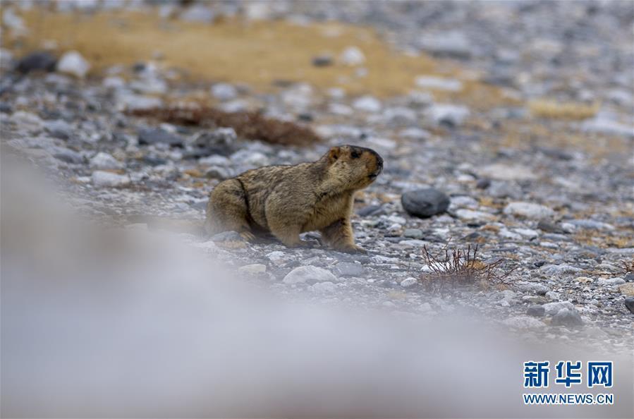 在珠峰国家级自然保护区内生活的旱獭(4月25日摄)。 珠穆朗玛峰山区高寒缺氧。然而,这里却栖息着一群雪域精灵。 新华社记者 旦增尼玛曲珠 摄