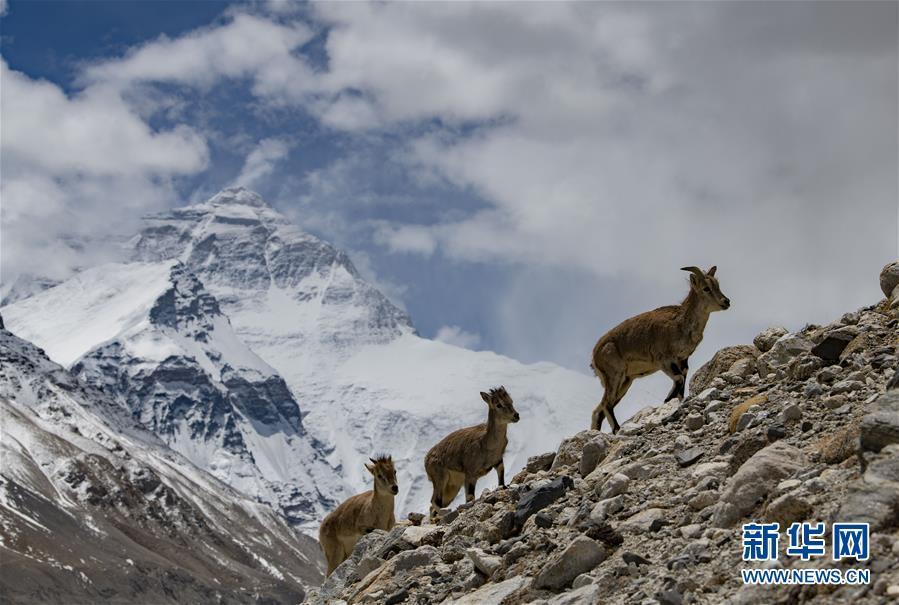 栖息在珠峰国家级自然保护区内的岩羊(4月29日摄)。 珠穆朗玛峰山区高寒缺氧。然而,这里却栖息着一群雪域精灵。 新华社记者 普布扎西 摄