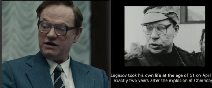 贾里德·哈里斯饰科学家瓦莱里·莱加索夫。 瓦莱里·莱加索夫是库尔查托夫原子能研究所的副所长,也是负责调查切尔诺贝利事故小组的一员。当上级政客试图掩盖灾难的原因和程度时,莱加索夫试图保持公开和诚实的态度来面对真正发生的事情。在调查结果公布的前一天,莱加索夫自杀了。八年之后,俄罗斯总统叶利钦授予他“俄罗斯联邦英雄”的称号,以表彰他勇于说出切尔诺贝利的真相。