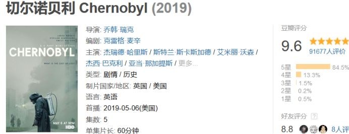 《切尔诺贝利》是由HBO和英国SKY电视台出品的5集迷你剧,豆瓣评分9·6,超过80%的人打出了五星。