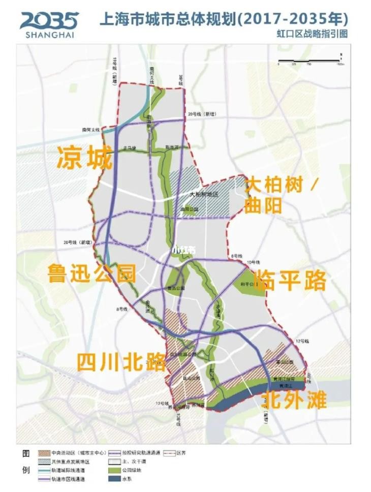 在上海十四五规划以及2035总体规划中,虹口区重点发展的区域可以分为三部分。北部功能区(广中路街道、曲阳路街道、凉城新村街道、江湾镇街道),中部居住区(四川北路街道、临平路街道)东部会客厅(北外滩)。