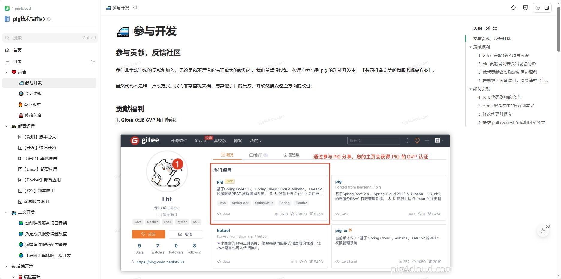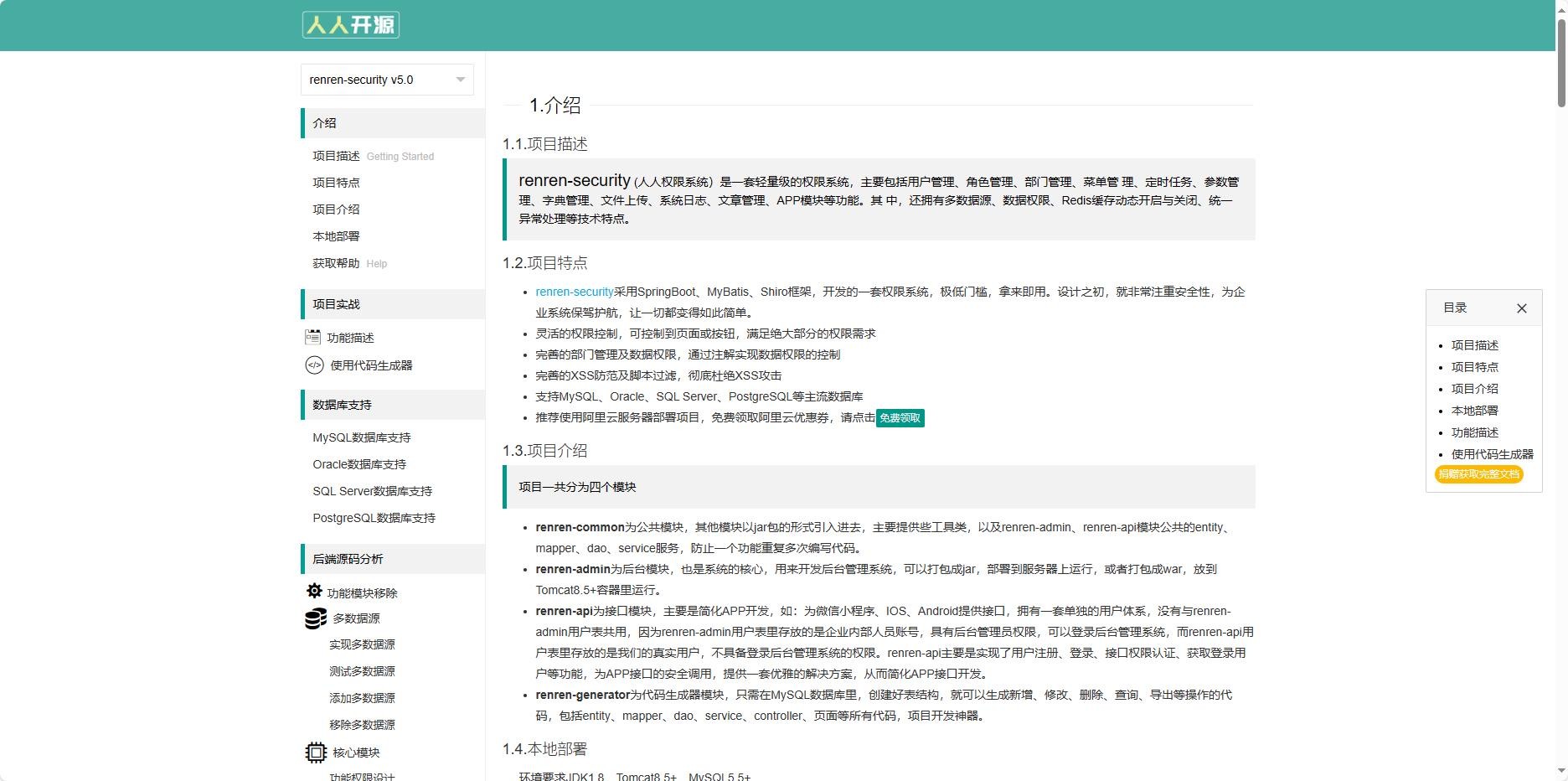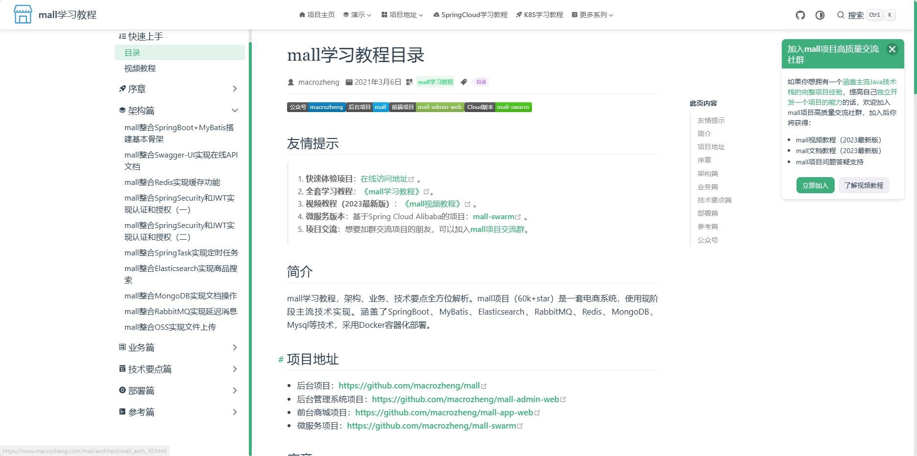 里边有讲解架构、业务、技术要点、部署等相关内容,通过架构篇可以达到快速了解Redis、RabbitMQ、Security、ElasticSearch、OSS文件上传,业务篇可以学习数据库表设计、权限管理等,技术要点篇可以各种工作中常见问题解答、设计与优化、版本差异、解决各种遇到的坑,部署篇包含Linux、Windows利用Docker等镜像工具部署。