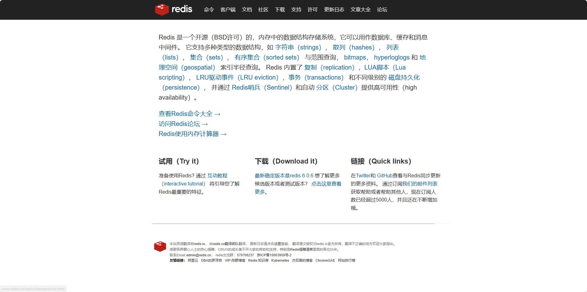 Redis 是一个开源(BSD许可)的,内存中的数据结构存储系统,它可以用作数据库、缓存和消息中间件。 它支持多种类型的数据结构,如 字符串(strings), 散列(hashes), 列表(lists), 集合(sets), 有序集合(sorted sets) 与范围查询, bitmaps, hyperloglogs 和 地理空间(geospatial) 索引半径查询。 Redis 内置了 复制(replication),LUA脚本(Lua scripting), LRU驱动事件(LRU eviction),事务(transactions) 和不同级别的 磁盘持久化(persistence), 并通过 Redis哨兵(Sentinel)和自动 分区(Cluster)提供高可用性(high availability)。